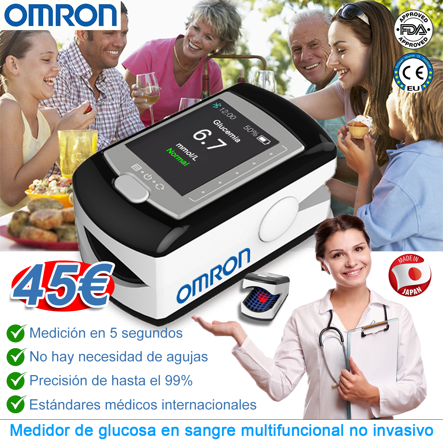 Medidor de glucosa en sangre no invasivo Omron (medición de 5 segundos/99% de precisión)